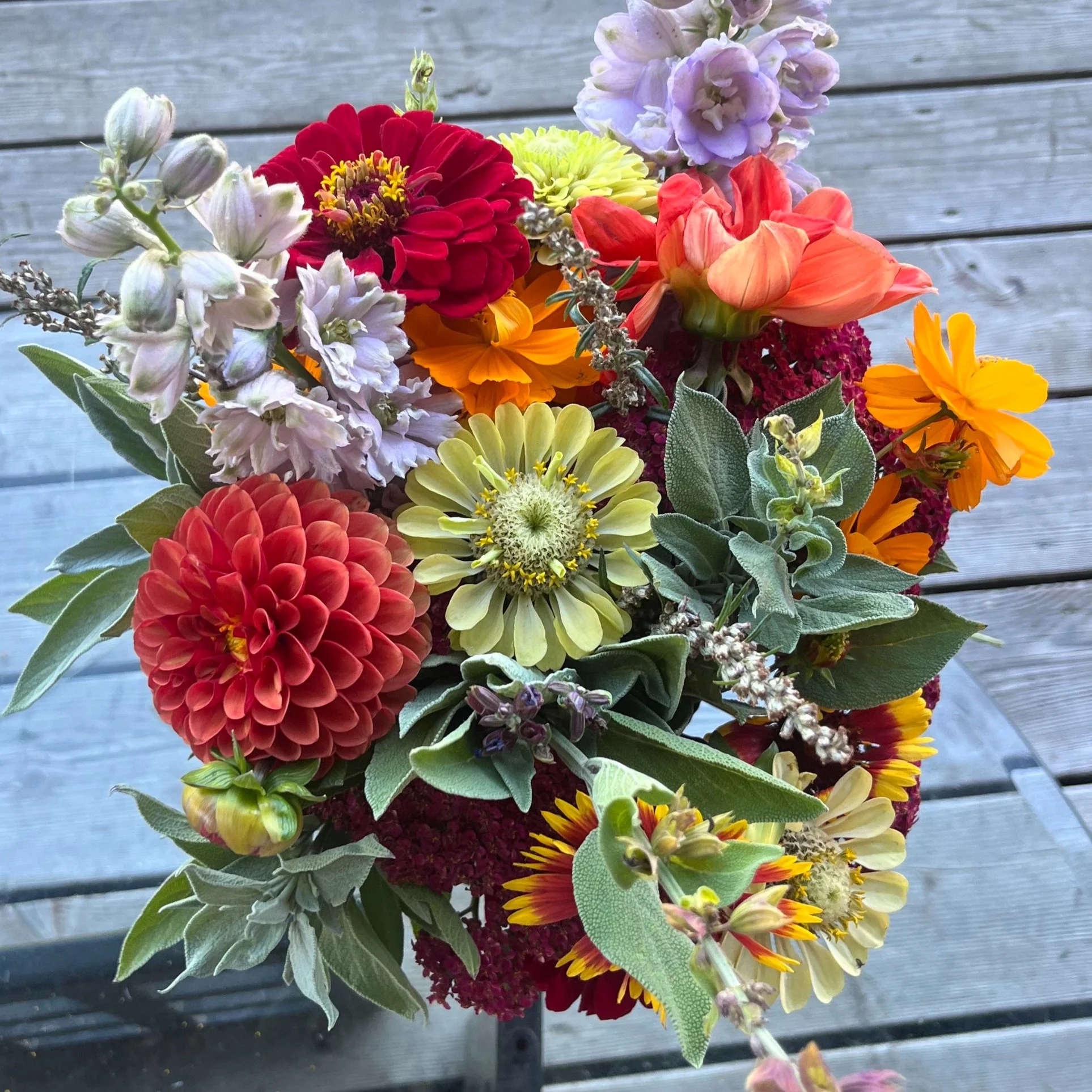 It is a joy and a challenge to arrange floral pieces throughout the seasons! In 2025, we are offering Bouquet CSA, Bouquet Delivery & Wholesale Flowers!